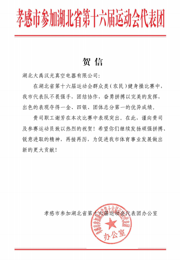 Below is a thank-you letter from the delegation office of the 16th Hubei Provincial Games!