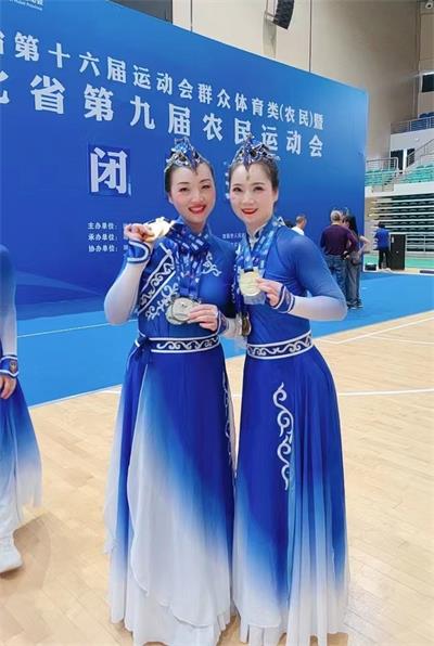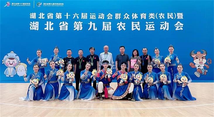 熱烈祝賀謝芳同志(照片中第一排從左到右第三位)在湖北省第十六屆運(yùn)動會群眾類(農(nóng)民)健身操團(tuán)體比賽中獲得一枚金牌,四枚銀牌,團(tuán)體總分第一的優(yōu)異成績。